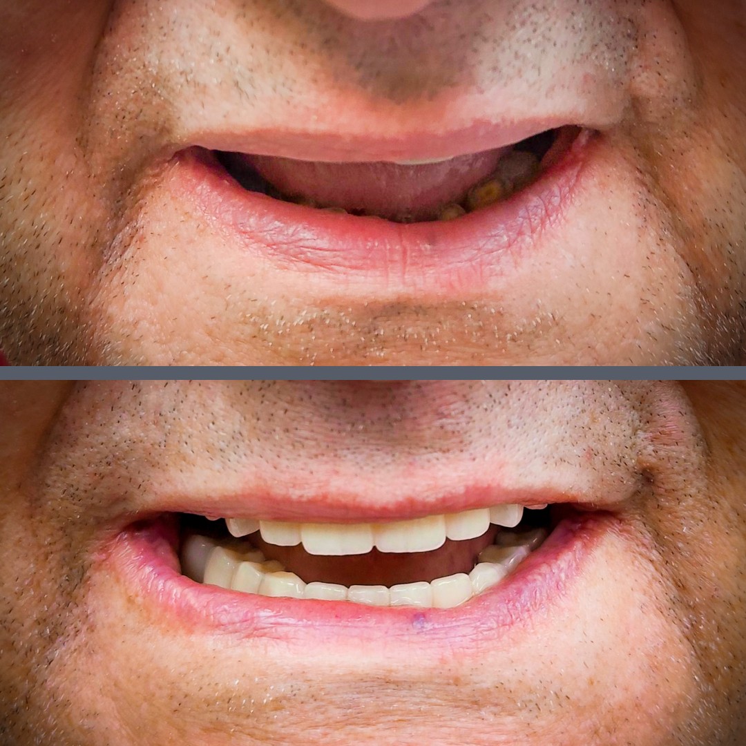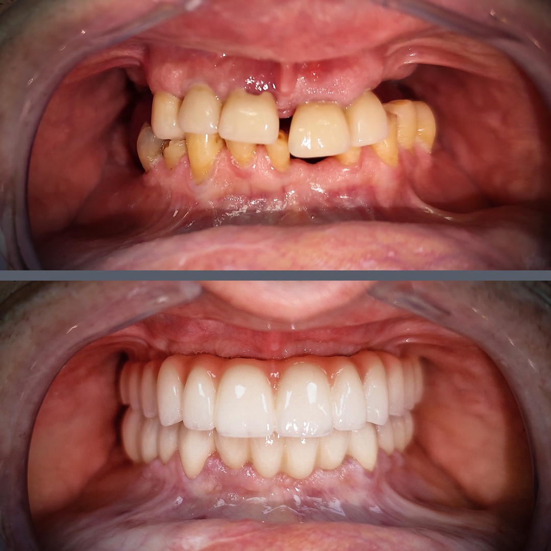Az átalakulás már az első pillantásra látványos. A végleges All-on-4® pótlások harmonikus, rendezett mosolyt adnak, amely érezhetően derűsebbé teszi páciensünk megjelenését. Az esztétikai változás mellett a funkcionális eredmények is kiemelkedőek: a rágás újra kényelmes és biztonságos, a beszéd tisztább, a mindennapi komfortérzet pedig jelentősen javult. Mindezt alig több mint négy hónap alatt sikerült elérni.