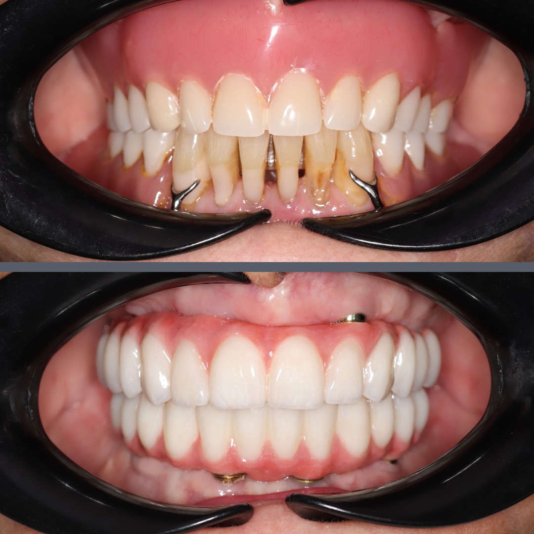 Mivel felül a teljes fogvesztés miatt már nem volt mit húzni, így ott azonnal beültettünk négy Nobel Biocare implantátumot. Alul első lépésként eltávolítottuk a megmaradt, ám menthetetlen fogakat, majd ugyanazon szájsebészeti beavatkozás keretében behelyeztük az implantátumokat. Néhány napon belül a páciens megkapta a fix alsó-felső ideiglenes hidat. A gyógyulási idő letelte után a labor elkészítette a végleges cirkónium pótlást, amit rögzítettünk a szájában.